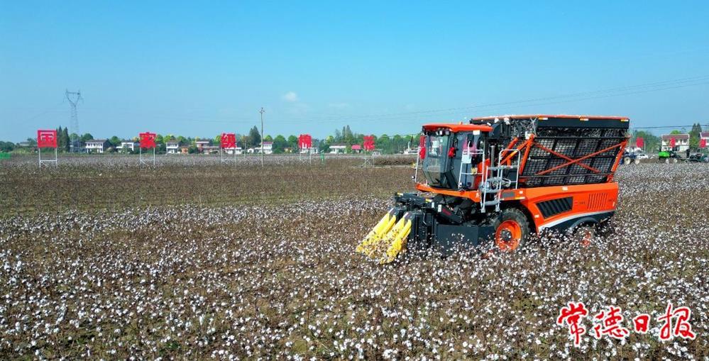 盛开的棉花犹如白雪连成一片,大型采棉机穿梭其间,通过采摘、收集、打包、出仓完成棉花采收工作