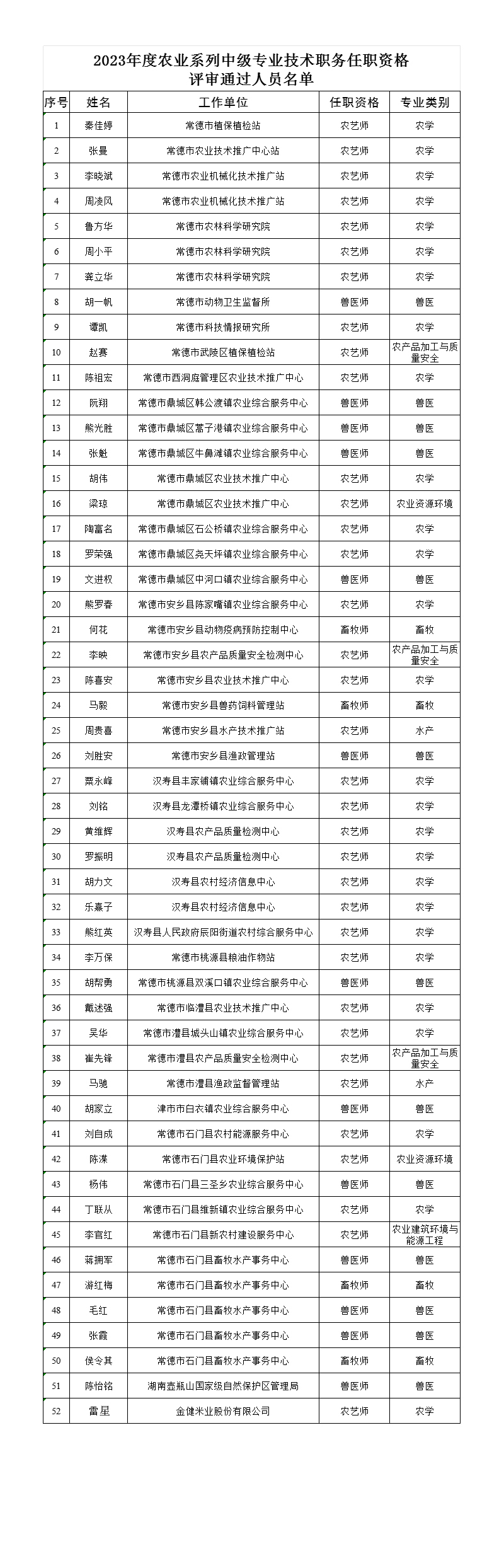 2023年度常德市农业系列中级职称评审结果公示